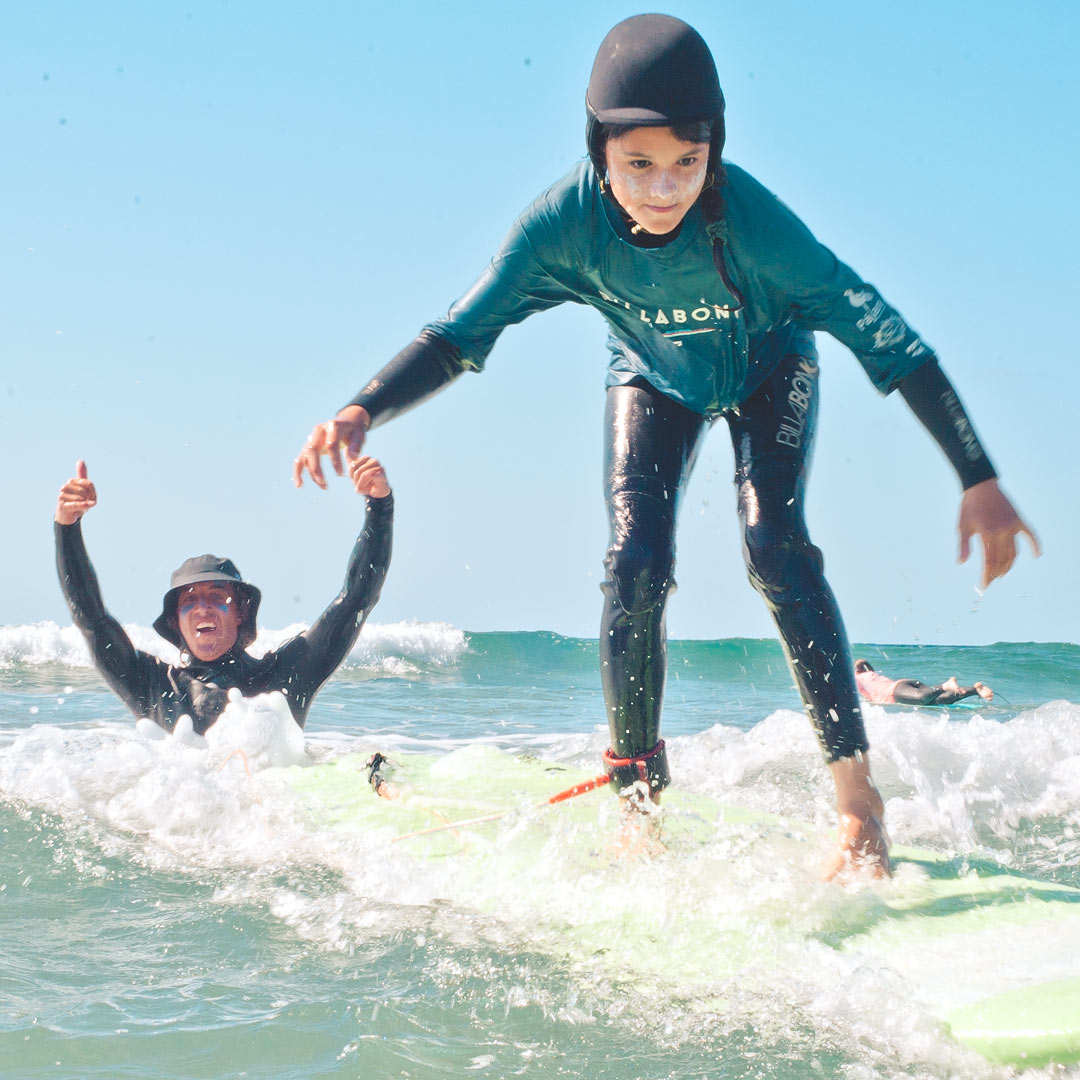 Para garantizar que nuestros surfistas más jóvenes se sientan seguros y se diviertan en el agua, enseñamos a los niños (cuyos padres no participan en el curso de surf) en grupos de un máximo de 4 niños por instructor de surf.